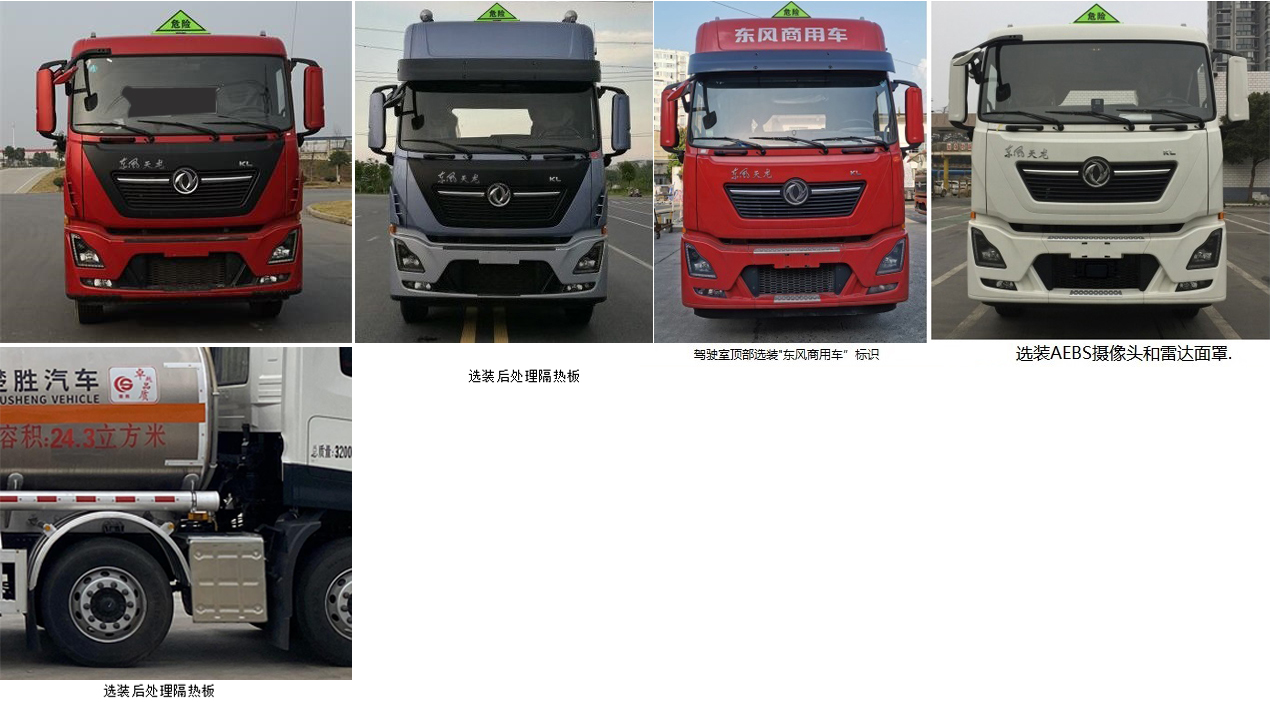 | 其它: | 1、該車適用于危險(xiǎn)品運(yùn)輸,運(yùn)送危險(xiǎn)貨物車輛類型為:FL型。準(zhǔn)運(yùn)介質(zhì)最大密度:850千克/立方米,罐體總?cè)萘?4.3立方米,罐體有效容積23.64立方米,罐體外形尺寸(長(zhǎng)×寬×高)(mm):8200×2300×1600。2、側(cè)防護(hù)材料為鋁合金,螺栓連接;后防護(hù)材料為Q235,螺栓連接,截面尺寸(mm)80×140,下邊緣離地高480mm。3、僅采用軸距(mm):1995+4500+1350。隨底盤選裝平頂駕駛室;選裝駕駛室前面罩;高頂駕駛室頂部氣喇叭為選裝件;駕駛室前角擾流板為選裝件,選裝駕駛室頂部"東風(fēng)商用車"企業(yè)標(biāo)識(shí),選裝AEBS攝像頭和雷達(dá)面罩。選裝后處理隔熱板。僅選用排氣管前置、限速裝置(限速80km/h)、前輪盤式制動(dòng)及子午線輪胎的底盤,轉(zhuǎn)向輪安裝爆胎應(yīng)急防護(hù)裝置,后軸采用空氣懸架。安裝帶衛(wèi)星定位功能的行駛記錄儀。EBS型號(hào)/生產(chǎn)廠家:EBS5/東科克諾爾商用車制動(dòng)系統(tǒng)(十堰)有限公司,VIE EBS/ESC-Ⅱ/浙江萬(wàn)安科技股份有限公司。發(fā)動(dòng)機(jī)/油耗值(L/100km)對(duì)應(yīng)為DDi75E350-60/38.1,L9NS6B400/38.2。4、選裝ETC。罐體上部選裝上走道,左右側(cè)后部選裝工具箱,選裝左側(cè)工具箱樣式。第二軸選裝弧形膠制擋泥板或方形擋泥板。 | ||