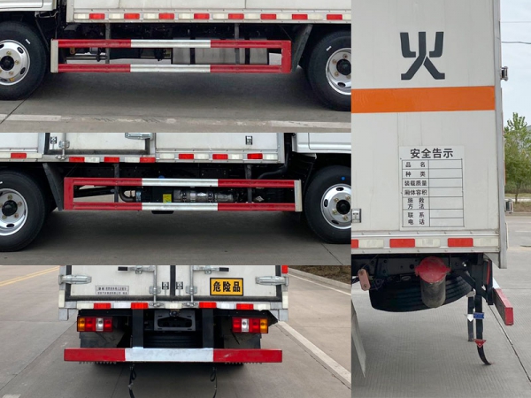 其它 | 1、該車為危險(xiǎn)品運(yùn)輸車.運(yùn)輸具有獨(dú)立容器(瓶)包裝的易燃液體物品.運(yùn)送危險(xiǎn)物品類項(xiàng)號:3類.廂體頂部封閉不可開啟.2、側(cè),后防護(hù)材料均為Q235,側(cè)防護(hù)螺栓連接,后防護(hù)焊接,截面尺寸(mm):100×50,下邊緣離地高430mm.3、整備質(zhì)量含備胎,滅火器及隨車工具;貨廂重量為1090kg;材質(zhì)/厚度:復(fù)合板結(jié)構(gòu)廂體:底板材質(zhì)為Q235,厚度3mm,側(cè)板為外Q235+中間阻燃泡沫+內(nèi)純鋁板,厚度42mm;瓦楞板結(jié)構(gòu)廂體:底板材質(zhì)為Q235,厚度3mm,側(cè)板為Q235,厚度1.5mm.4、僅選用排氣管前置、限速裝置(限速80km/h)、前輪盤式制動(dòng)及子午線輪胎的底盤,轉(zhuǎn)向輪安裝輪胎爆胎應(yīng)急防護(hù)裝置,安裝具有衛(wèi)星定位功能的行駛記錄儀.ABS系統(tǒng)控制器型號/生產(chǎn)企業(yè): APG3550500A/浙江亞太機(jī)電股份有限公司,3550B500/浙江亞太機(jī)電股份有限公司,VIE ABS-II/浙江萬安科技股份有限公司.發(fā)動(dòng)機(jī)/油耗值(L/100km)對應(yīng)關(guān)系為:JX493ZLQ6D/10.75,JX4D25A6H/10.83.隨底盤選裝駕駛室,選裝白色中網(wǎng),選裝白色前保,選裝黑色前保,選裝廂體側(cè)面選裝開門型式及位置,選裝不帶側(cè)開門,選裝貨廂平面或瓦楞結(jié)構(gòu);廂體側(cè)面選裝開百葉窗,選裝后部樣式,該車可選裝直接供電式ETC車載裝置. | ||